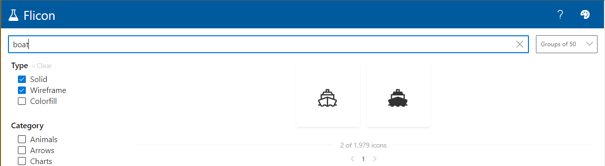 The basic operation is very simple. Type in a search term for the icon you are looking for. The interface will instantly update to show the results. For example, type “boat”
