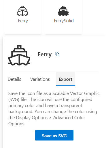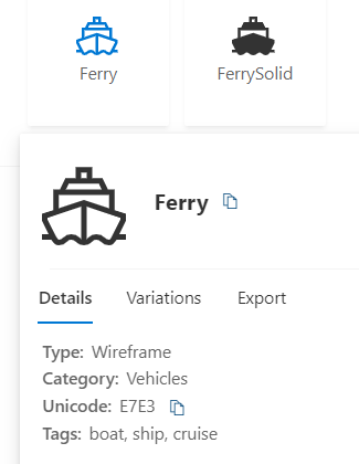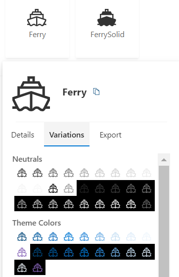 We would have needed to enter “ferry” in the Fluent UI website to find these same icons. While turning on names is one way to see the icon’s name, hovering over the icon will show you all of the details about the icon, including Name, Type, Category, Unicode and Tags. Additionally, there are tabs in the hover card for Variations, and Export. Variations show some different views of colors and shading for the icon. Export lets you save any icon as a scalable vector graphic (svg) file in the desired color with a transparent background.