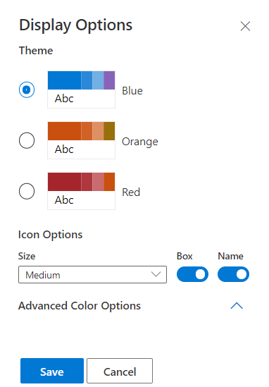 You can change the theme to several options. (I trimmed the image down to 3, but there are more.) You can also change the size if the icons, determine if the name is displayed in the results, and whether a box is drawn around each icon in the results. The Advanced Color Options gives more fine-turned options for the color of the icons in the results. This is also where you can set the color of the icon before you export it.