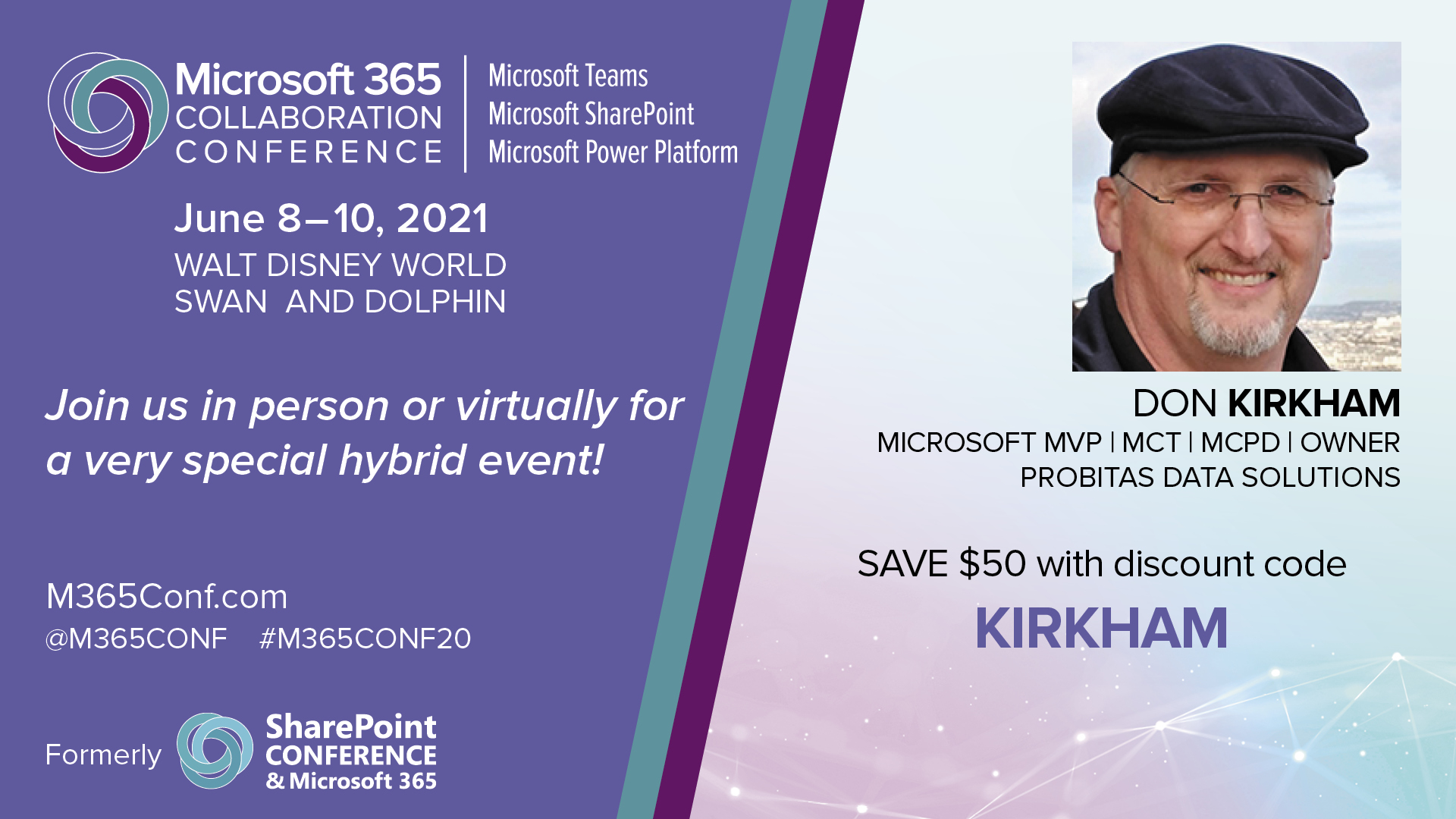 Conferences are slowing coming back and I am personally looking forward to talking to attendees, sponsors, and speakers in person again. First on the agenda this year is the M365 Collaboration Conference (formally the SharePoint Conference) in Orlando, FL, Jun 8-10. The “big” conference is still scheduled for Las Vegas in December, but this is a hybrid event that promises to be an exciting time as we transition from the virtual world we have lived in for the past year. I am honored to be chosen to deliver a couple of sessions during the conference and am looking forward to the trip.