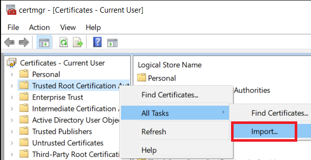 Problem solved–almost! The .pem extension is just a generic certificate extension, so it works (almost) the same the previous .cer extension. The one difference is that Windows does not have a file association with .pem, so there is not option to “Install Certificate” like before. The solution is to open the Certificate Manager and “Import” the certificate, as shown below.