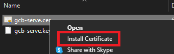 Navigating to the location “/home/donkirkham/.gcb-serve-data” permits me to install the certificate in the Windows Certificate Store and then proceed with development normally. (Pro Tip: For WSL, open Windows Explorer with the command “explorer.exe .”, then navigate to the “/home/donkirkham/.gcb-serve-data” folder and right click on gcb-serve.cer file to install. Be sure to install in the Trusted Root store)