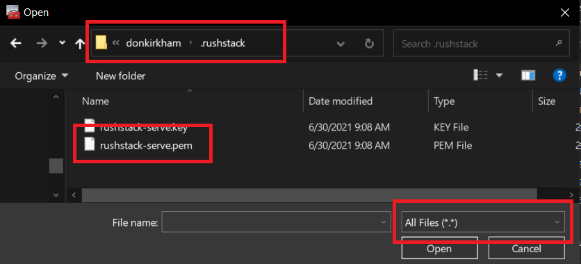 As shown in the second image, when you select the Certificate, you will need to navigate to the correct path and change the File Types to “All Files (*.*)” in order to select the rushstack-serve.pem file. Once installed, everything should return to normal.