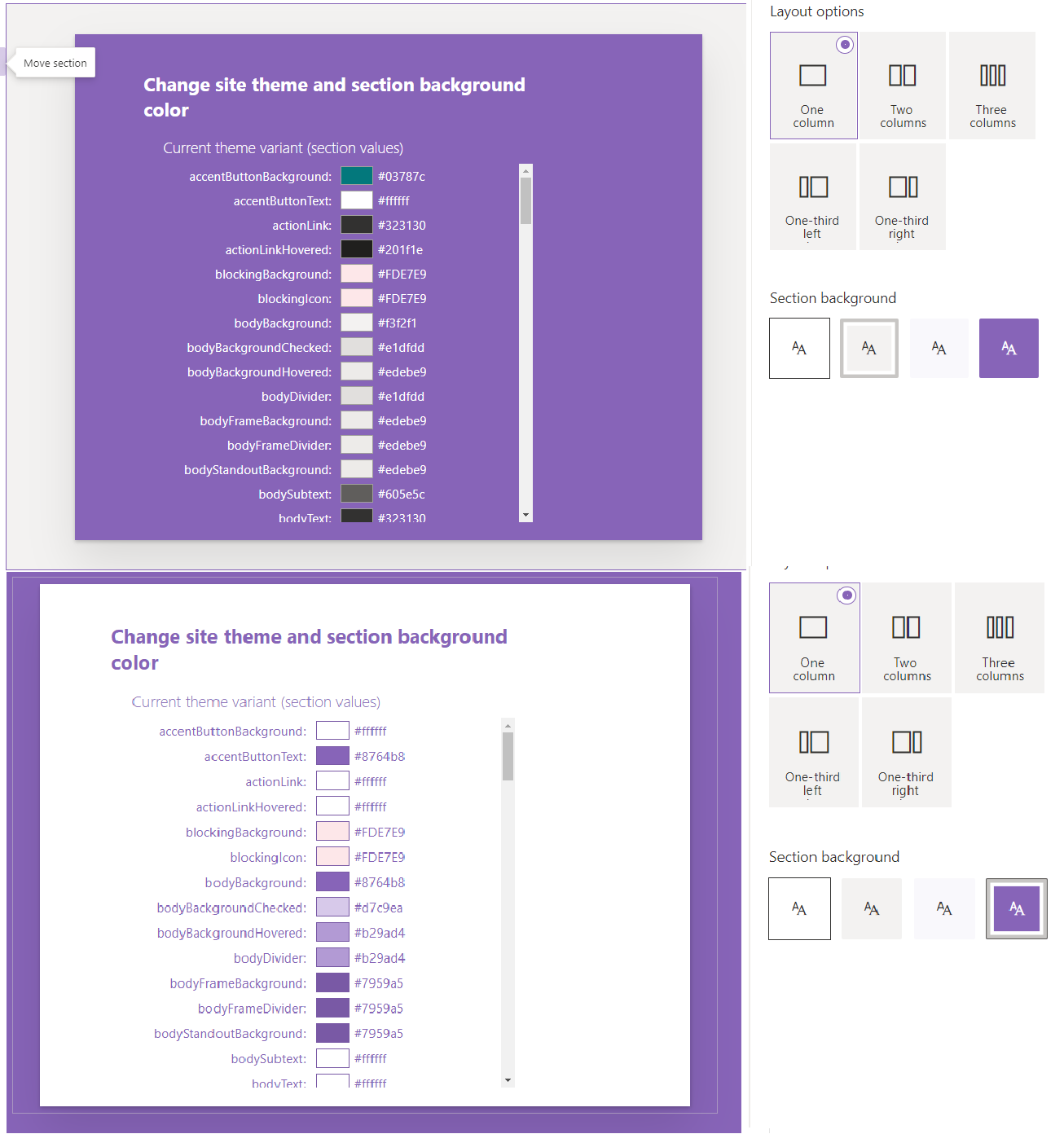 I think the CSS variable approach is the simpliest and most flexible of the patterns I have seen. Of course, you need to know the name of the semantic color you need, but that is not difficult to find. In the first project referenced below, I built a webpart that lists all of the semantic colors and shows the color assign based on the current theme and section background. Here is what the webpart looks like on two different section backgrounds, gray and purple.