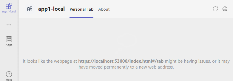 Once again, start Debug with Edge(F5). This time, the entire startup completes with no errors, including executing an “npm install”, which takes a minute or two, and opening Teams in the browser to the screen to add the new app. It all looks good until the contents of my new tab app never displays on the screen. Instead, this is displayed.