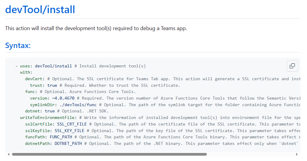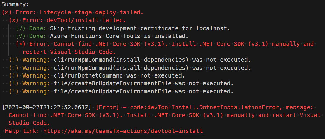 I again go to the “devtool-install” link at the bottom and find a troubleshooting section for the error I encountered about .NET SDK.