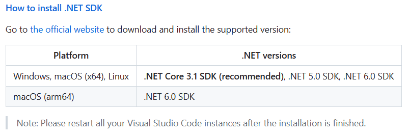 dotnet --list-sdksand you should see that “6.0.415” is listed.Restart all instances of VS Code again